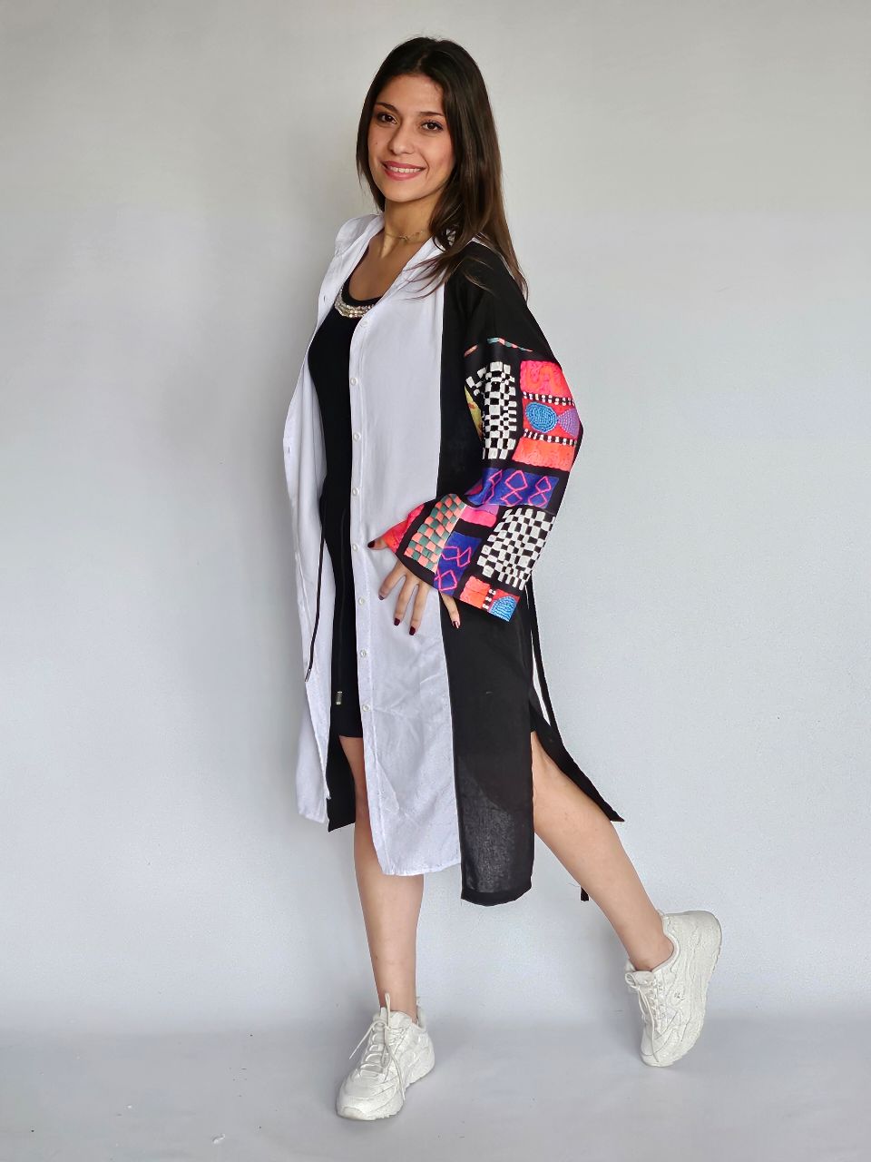 Boho Style Black and White Cardigan with Colorful Sleeves