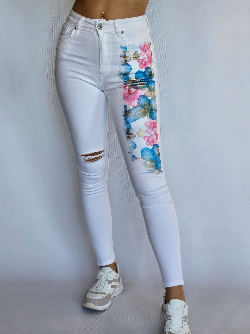 White Jeans with Metallic Flowers