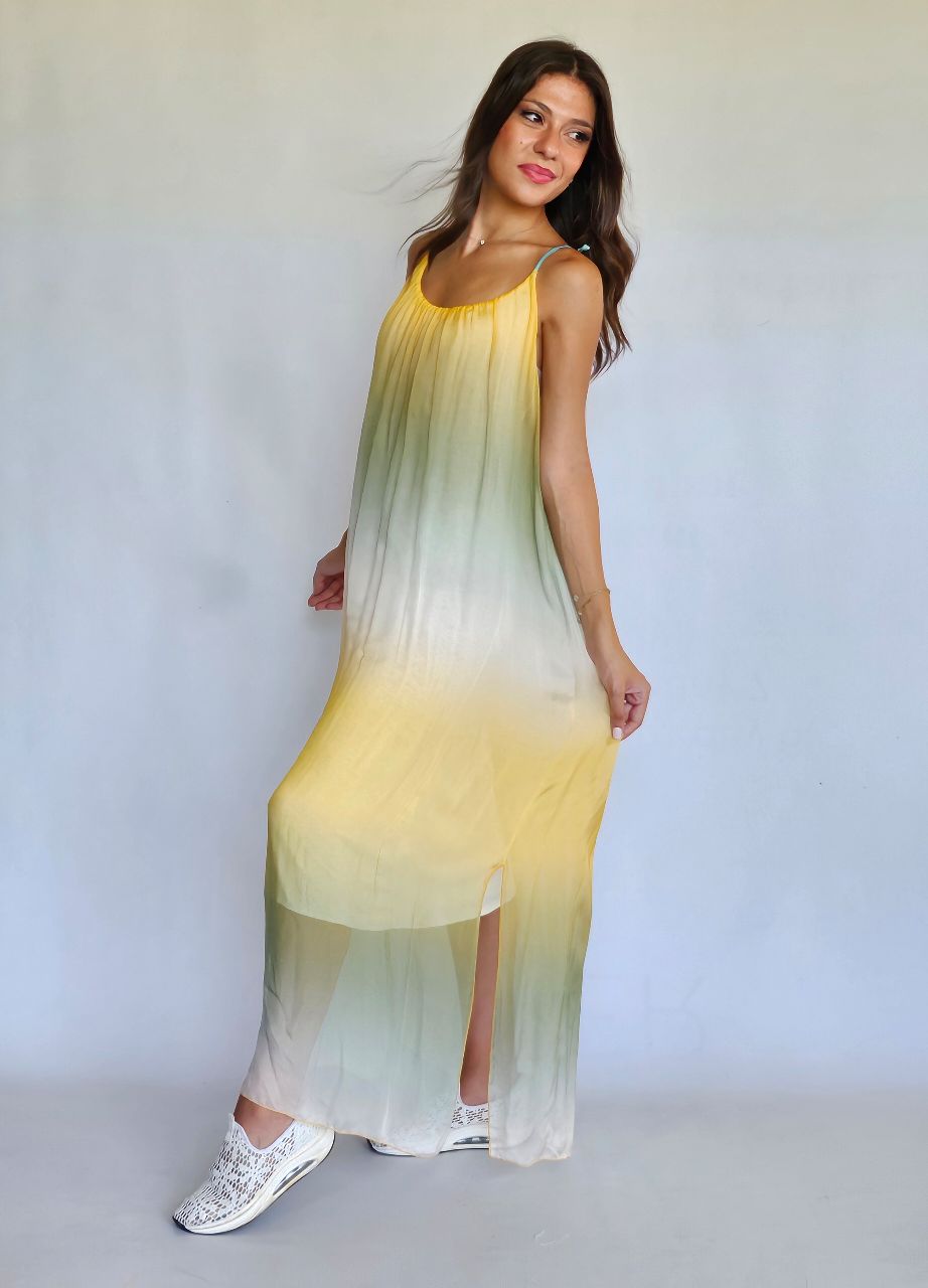 Chiffon Tie Dye Long Dress available in Orange&Fuchsia and Yellow&Green One Size Fits all.